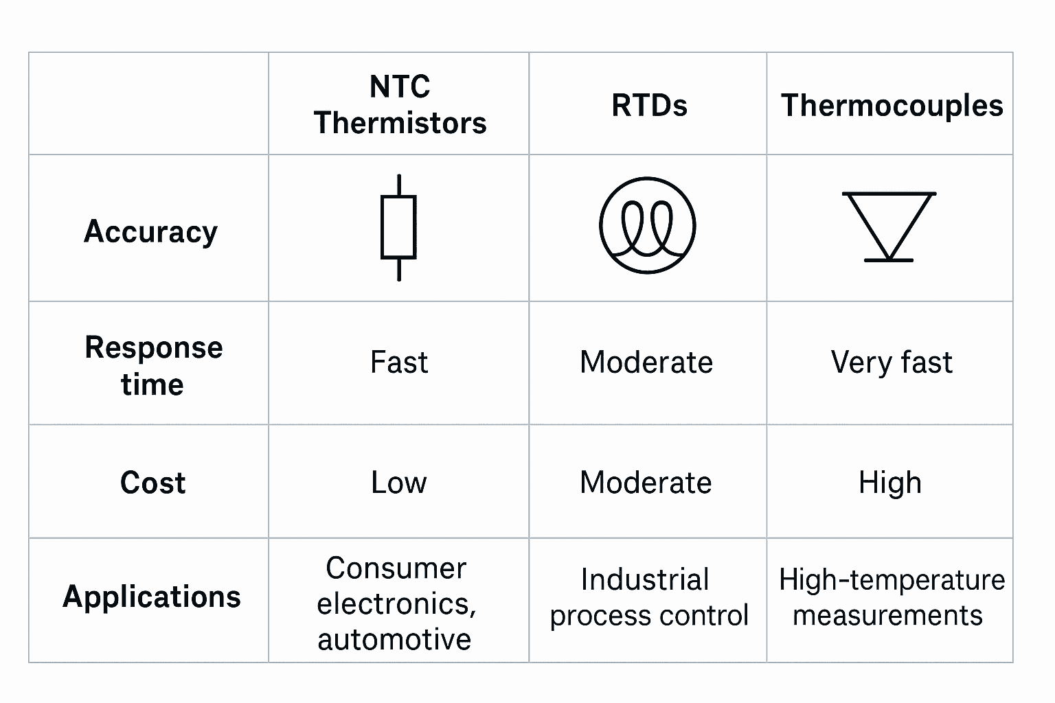 RTD (e.g. PT100 / PT1000) Extremely high Moderate Higher Industrial, lab, critical-precision environments