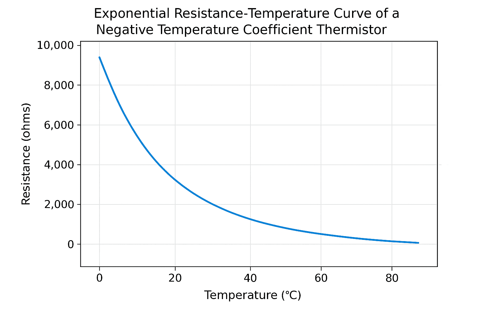 NTC thermistors follow an exponential curve: resistance drops rapidly in certain temperature ranges. This non-linear behavior gives them extremely high sensitivity within their specified operating range.