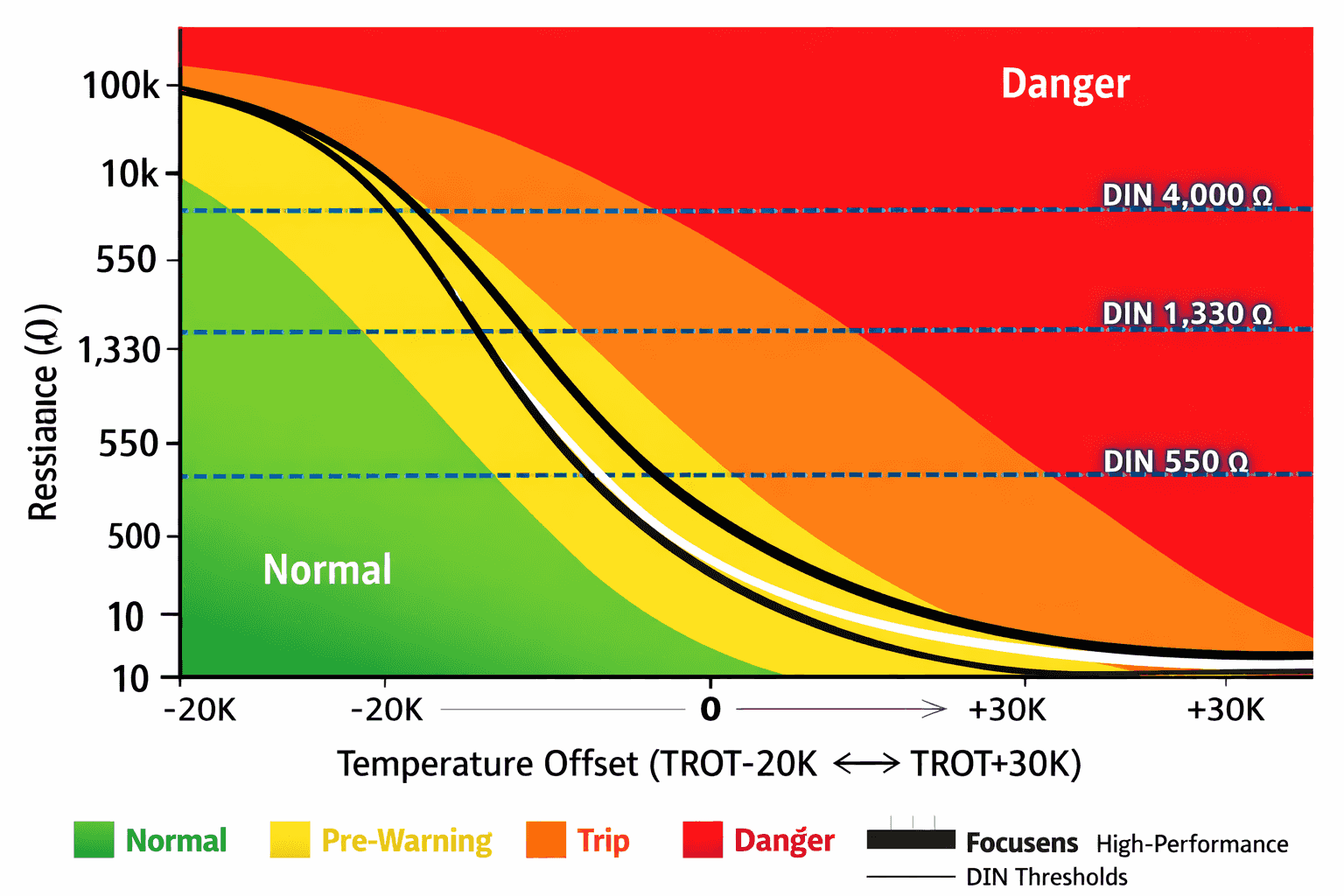 TROT +5K >1,330 Ω ≤2.5 V DC Ferroelectric phase 20–35 %/K Focusens Premium: 28–32 %/K coefficient, trip within 0.5–1.5 s (faster than DIN 3 s minimum)