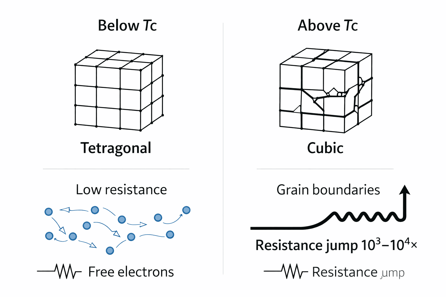 • Below Tc: Tetragonal crystal structure, free electron mobility, low resistance (30-250Ω)